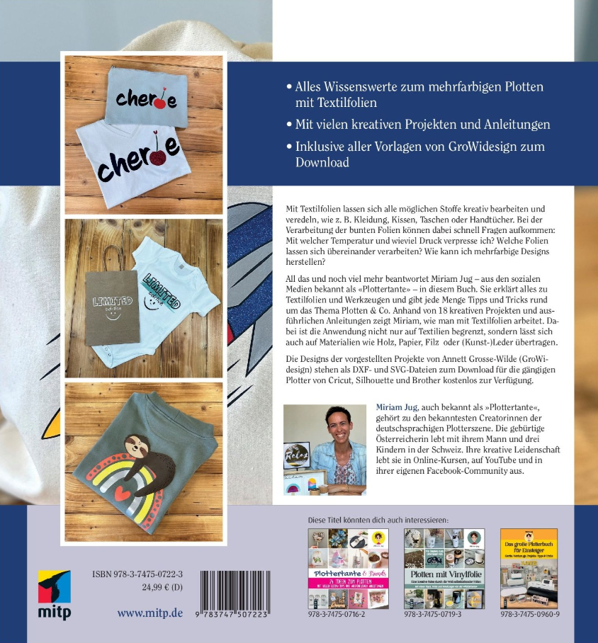 Tauche ein in die lebendige Welt des mehrfarbigen Plotterns mit Textilfolien! Erfahre von der bekannten „Plottertante“ Miriam Jug, wie du mit den richtigen Einstellungen und Techniken deine Stoffe wie Kleidung, Taschen oder Kissen kreativ und einzigartig gestaltest. Entdecke, wie du mehrere Folien übereinander verarbeitest und mehrfarbige Designs meisterst – nicht nur auf Textilien, sondern auch auf Holz, Papier, Filz und Leder. Mit 18 spannenden Projekten und praktischen Anleitungen plus kostenlosen Designvorlagen von GroWidesign bist du bereit, deine eigenen farbenfrohen Meisterwerke zu schaffen!